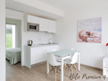 Whether you book a bilo premium, bilo premium plus or trilo premium plus apartment, all apartments are modernly furnished and fully equipped! The houses are on the ground floor with a furnished patio or on the first floor with a furnished terrace. Air conditioning as well as wi-fi and television is available. As an extra, the apartments of the "plus" type offer a larger induction hob and a dishwasher. The bilo houses are suitable for a maximum of four people. TThe trilo apartment for up to six people has 2 bedrooms, 2 bathrooms and a living room with sofa bed. In Capo Falcone Apartments you can also use a shared barbecue area, washing machines and dryers in the laundry room, the playground and bicycles are available for free.