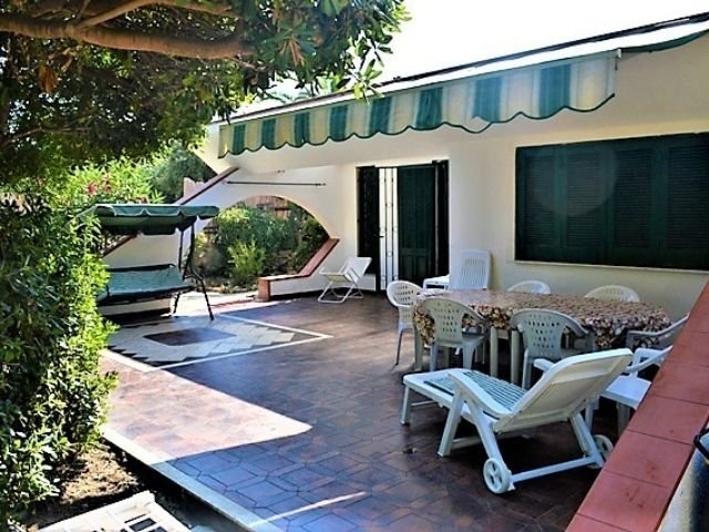 The holiday home Casa Rosa di Costa Rei enjoys a privileged location right on the beach: from the garden gate it is only a few steps to the sea. There is also a large covered parking area for two cars and a well-maintained garden. Palm trees, oleanders, roses and other plants provide Mediterranean charm. A large terrace with an awning, table and chairs and a porch swing invite you to relax. Here you can rest or just enjoy the sound of the sea.