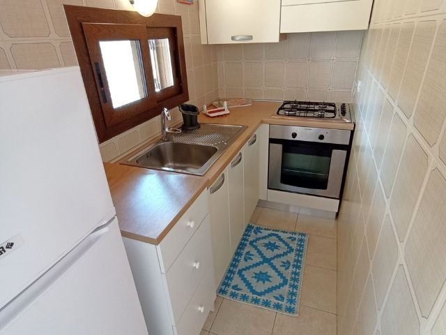 The fenced garden of these semi-detached houses can always be kept in view from the spacious, covered terrace. The living area, featuring a compact kitchenette and a functional dining space, provides access to the double bedroom with a matrimonial bed and is equipped with air conditioning. A bathroom with shower is also available. In the garden, guests will find a built-in barbecue grill as well as an outdoor shower with hot water.