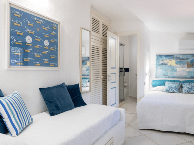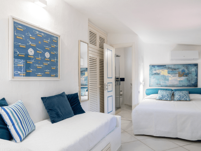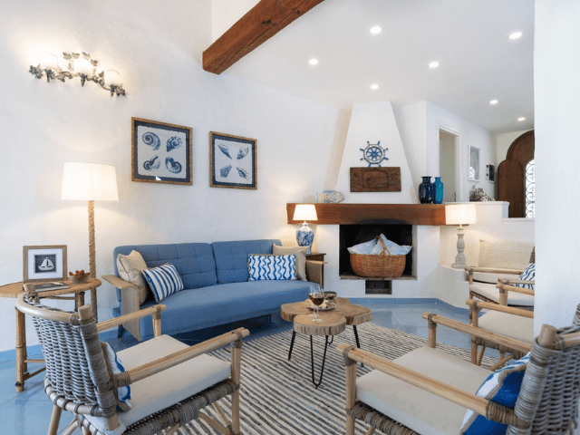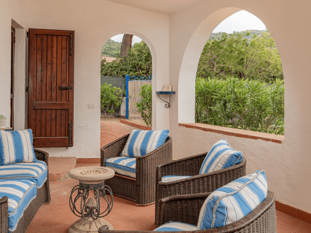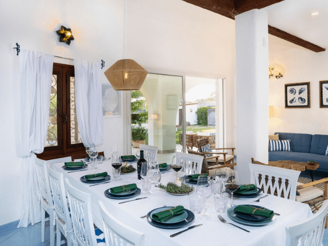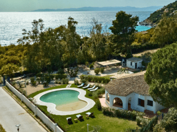 Inside, the villa features a bright, open-plan living area with a warm, welcoming atmosphere and sea views, complemented by a fully equipped kitchen and comfortable, air-conditioned rooms. With 5 bedrooms and 6 bathrooms, Villa Sandra comfortably accommodates up to 10 guests, offering thoughtfully designed spaces that combine comfort, privacy, and authentic Sardinian charm.