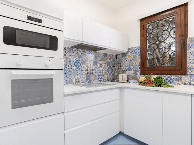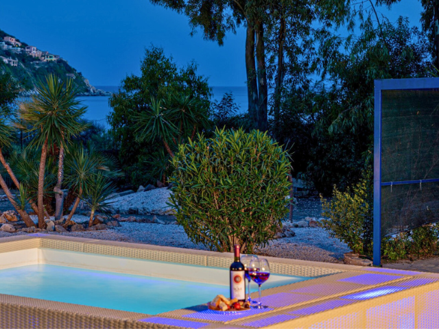 Outdoor spaces include a private swimming pool, several seating and sunbathing areas, and a garden designed for relaxation. An outdoor shower, barbecue facilities and a small unfurnished terrace with breathtaking sea views complete the offer. The laundry room is located outside, beneath the staircase leading to the terrace. All areas of the villa are air-conditioned, ensuring comfortable living even on hot summer days.