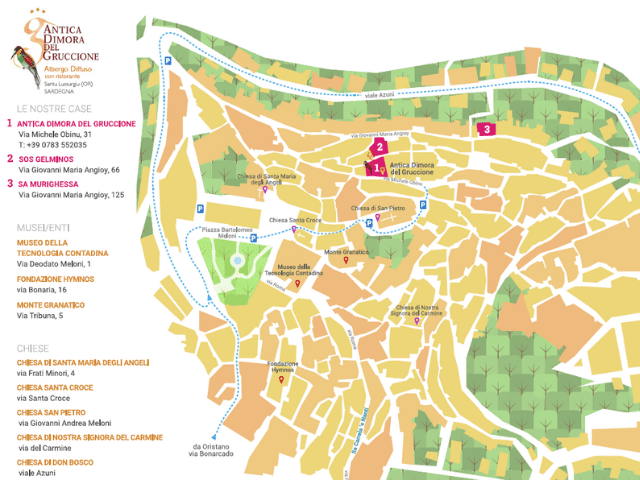 The "Antica Dimora del Gruccione" is a 17th century Spanish renovated mansion located in the monumental village of Santu Lussurgiu. The Dimora is an Albergo Diffusso, the rooms are spread over 4 old houses that are located within walking distance of each other. The houses are furnished with an eye for old details. The Dimora has a cozy restaurant (with an extensive wine list) where dishes and products from the region are served.