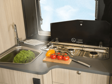 • Rental package: €64.90 (covers camper equipment and use, 2 gas bottles, chemical cleaning agents, cooking and kitchen utensils, and tableware)