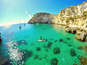The symbol of the capital Cagliari and also the spectacular sight; the cape Sella del Diavolo with surprisingly natural and unexpected views. The immense limestone rock "Sella del Diavolo" can also be admired from the sea. After a brief explanation from the instructor, you will receive a surfboard, leash and life jacket, all ready to enjoy four hours of stand-up paddle on your own. The colors of the water could hardly be more beautiful, the sea here colors from azure, baby blue to turquoise green, only interrupted by a few islands of weathered limestone. Magnificent! Gulls and cormorants have their realm here and just above sea level you can see a few hidden caves. Once you arrive at a mini pebble beach, you can unpack your snorkeling equipment and explore the underwater world. Just a spectacular landscape a few kilometers outside of the largest city in Sardinia.