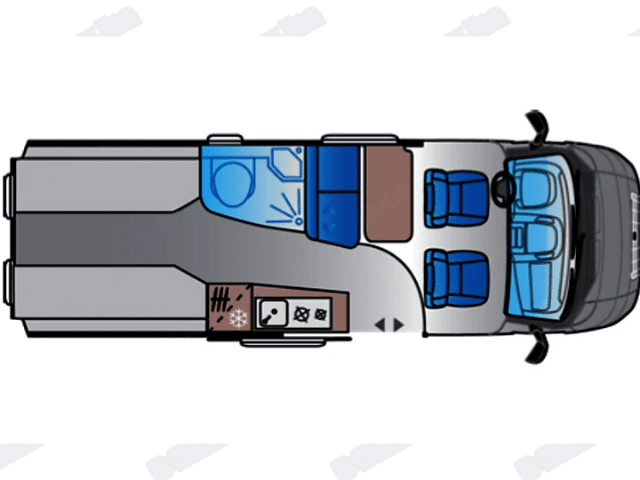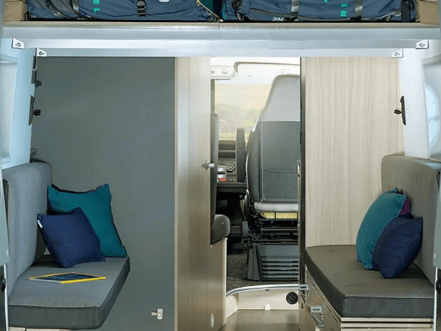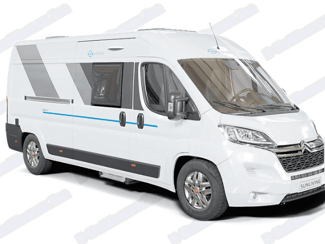 The 84-liter compressor fridge ensures good autonomy and excellent food storage capacity. The van also offers multiple smart solutions to maximize storage in every area, including wardrobes, overhead cabinets, and floor compartments. The electric step makes entering and exiting via the sliding side door easier. An additional hanging bed can be easily deployed to provide an extra sleeping space or serve as additional storage. The Sun Living Van 60 SP FAMILY also features a bathroom with a shower.
