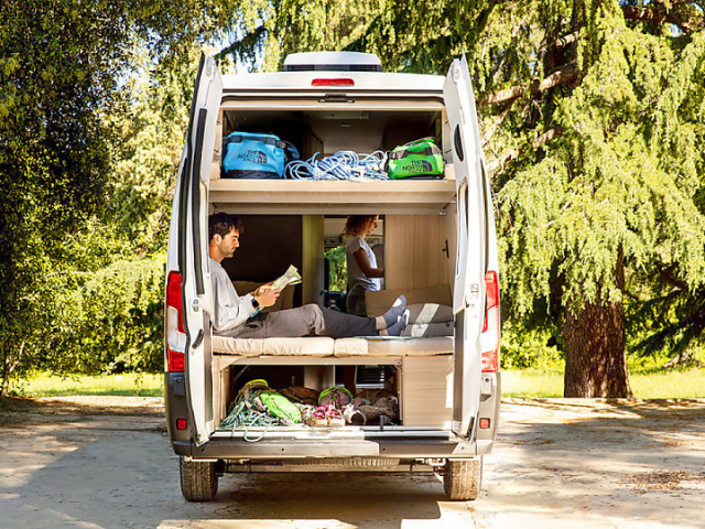 Camper rental Sardinia: Van V 60 SP FAMILYThe V 60 SP FAMILY is a large, 6-meter-long van with extra height and flexible rear space that can be used as either living or storage space, depending on your needs. It features 2 spacious rear seats that can be converted in seconds into a sleeping area for up to 4 people. The rear bedroom can be transformed into a roomy garage box thanks to the foldable double bed.
